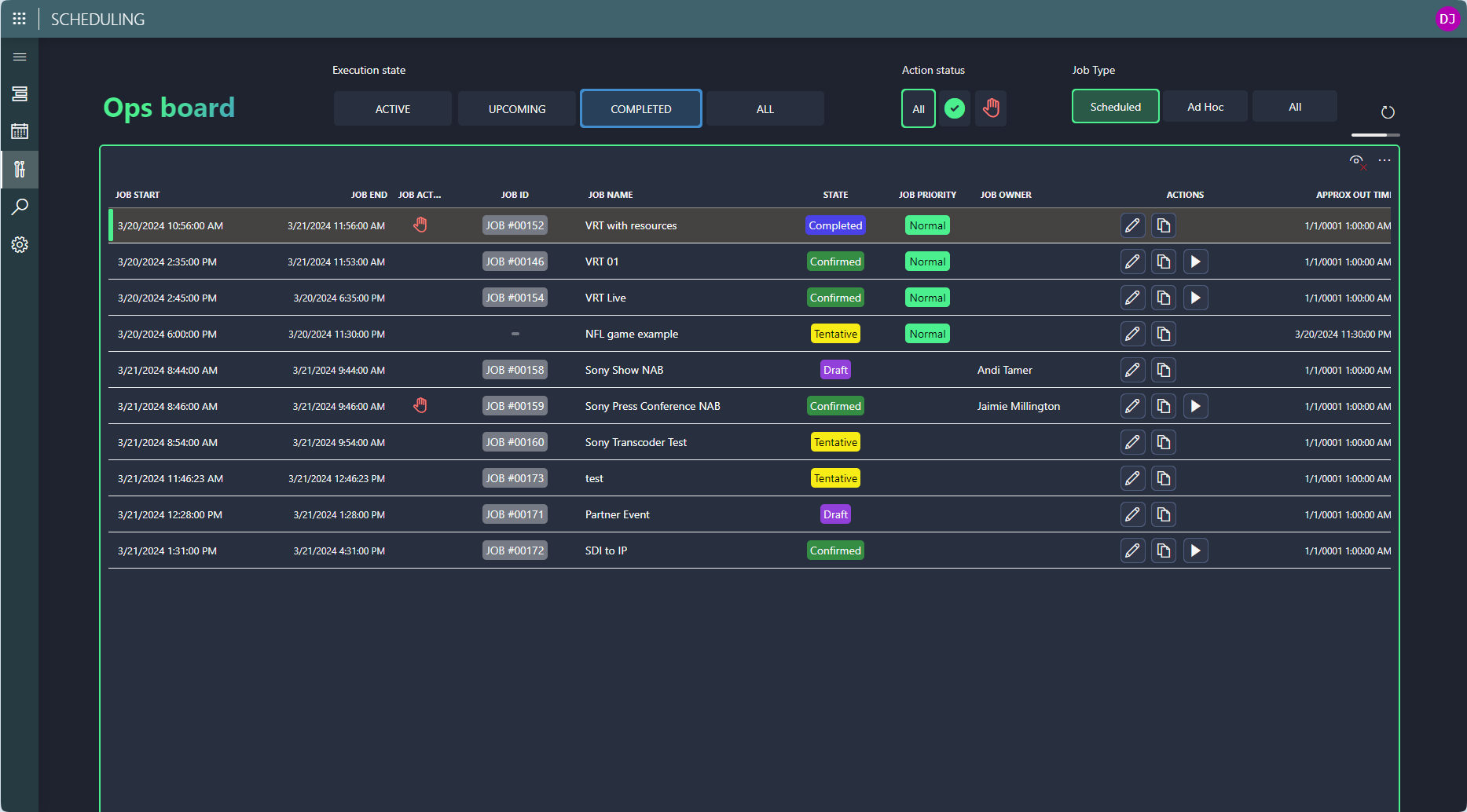運用管理: オペレーション・マネージャーを使用すれば、今後予定されているジョブ、アクティブなジョブ、完了したジョブを常に把握することができます。この機能は、ジョブの進行状況を監視し、作業負担を効果的に管理するための不可欠なツールをオペレーターに提供します。事前に定義されたフィルタとクイックコントロールが操作を合理化し、スムーズなワークフロー管理を実現します。